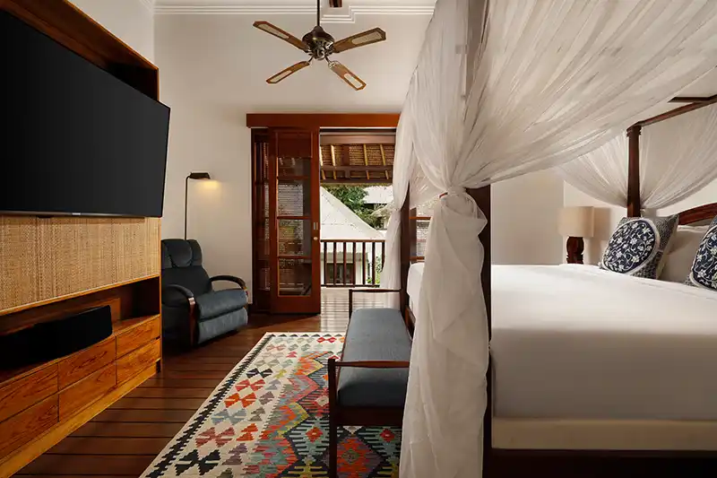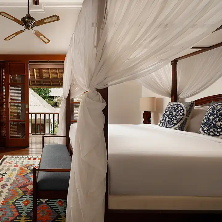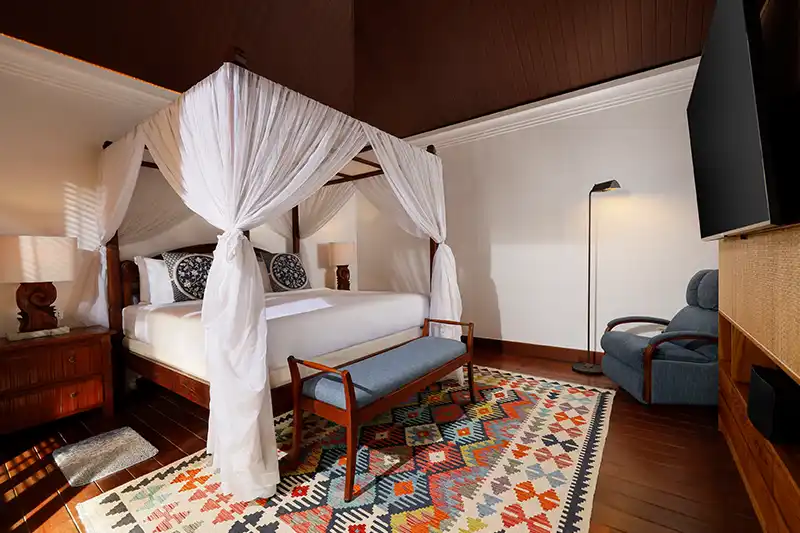 Approaching Villa Edward, the inviting blend of traditional thatched roofs and classic American charm welcomes you into an indoor-outdoor haven. The villa itself is thoughtfully divided into two distinct buildings—the living area and the sleeping area—with the pool and patio nestled in between.